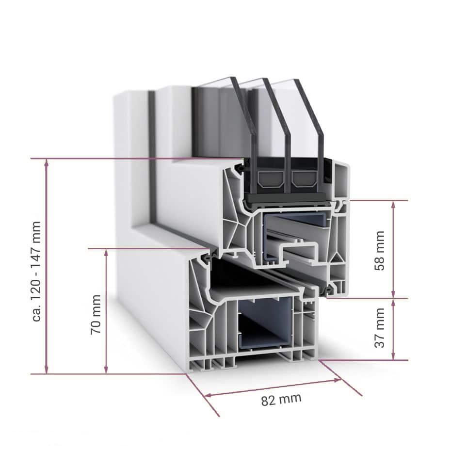 • 7 légkamrás német műanyag ablakprofil 82mm vastag tok és szárny vastagsággal